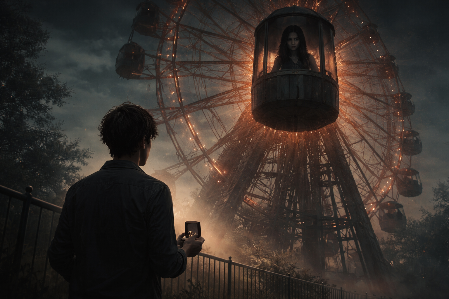 鼓動が早まる。観覧車を見上げると、ゴンドラの一つに人影が見えた。赤い光の中、窓際に座る女。こちらをじっと見下ろしている。