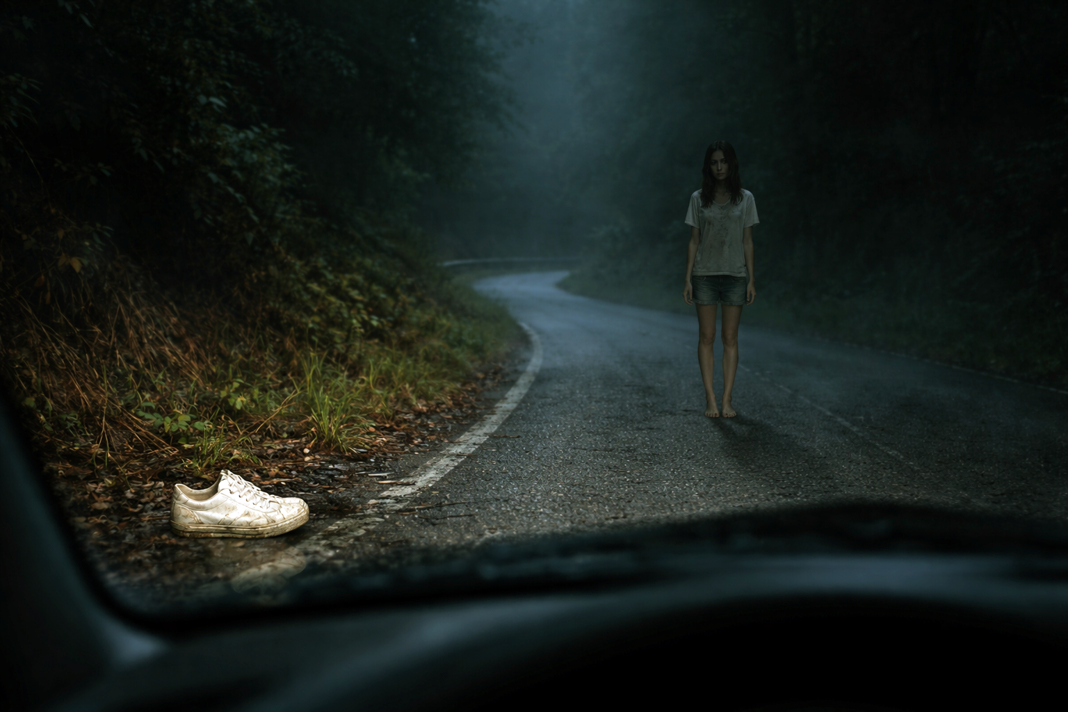 左の路肩に、白いスニーカーが落ちていた。片方だけ。