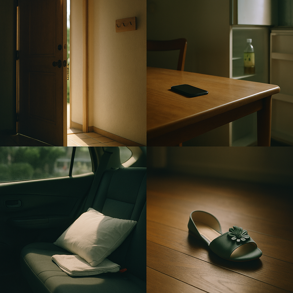 “すぐ戻る”設計を示す無施錠と携帯置き去り、2) 生活小物の持ち出しが「車での短距離移動」を自然化、3) 自家用車は残置だが別車の存在で解ける、という三点が一つの行動シナリオに収束する。