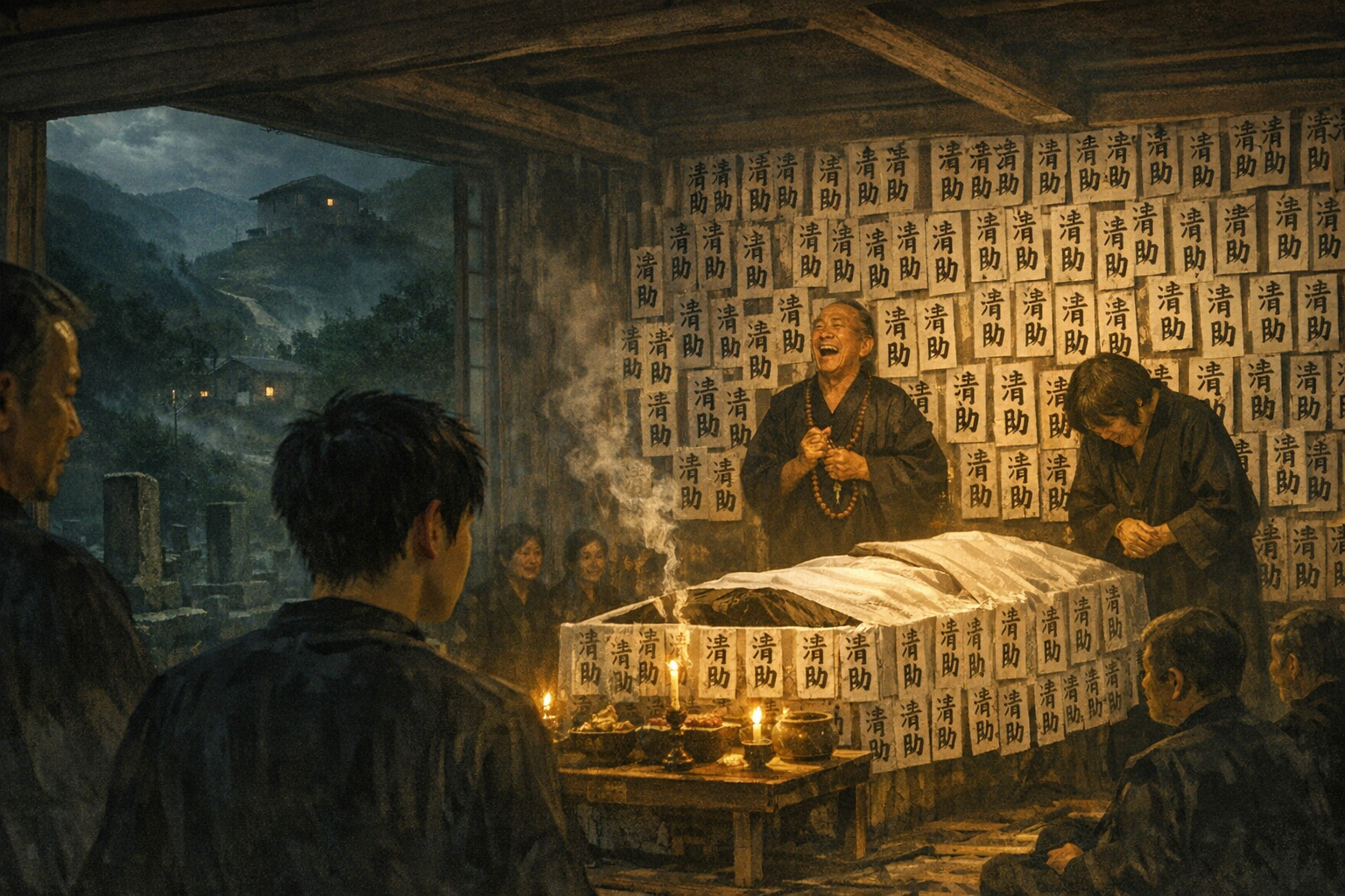 お経も無く、変な平屋のような場所に棺桶が置かれており、びっしりと清助の名前が書かれた札を貼っていて、その挙句、親戚の何人かは笑っているのである。