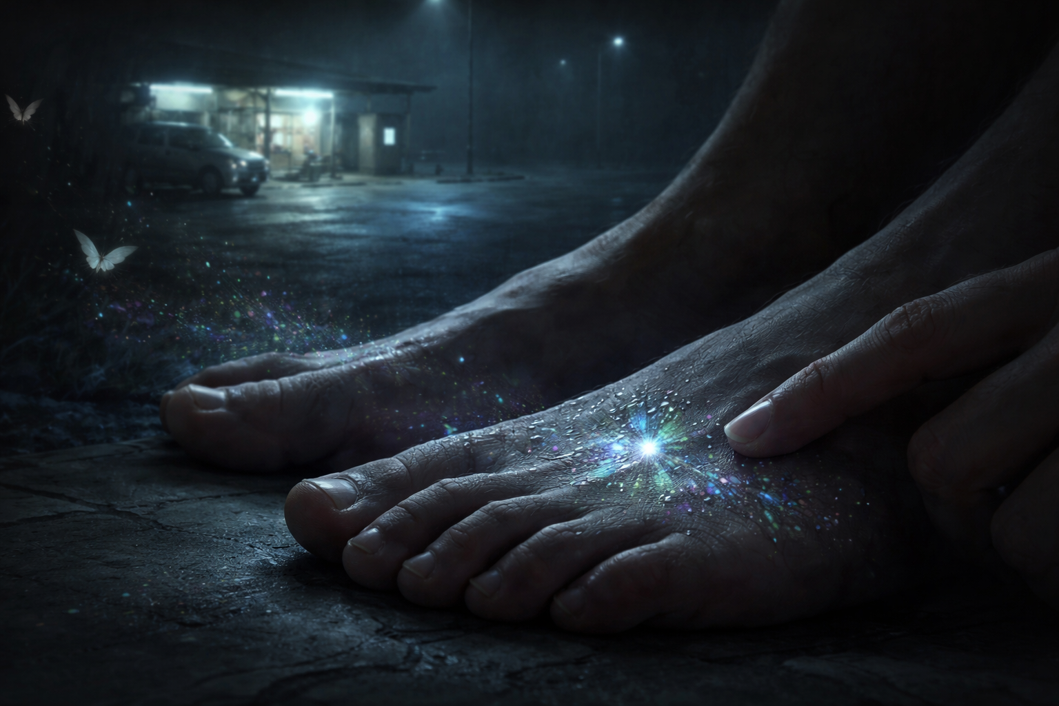 先日、靴を脱いだとき、足の甲に微かな光があった。白い粒がいくつも付着している。指で払っても、落ちない。爪で弾くと、かすかに薄い板の感触がした。