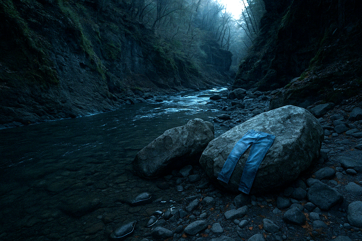 数十枚目あたりだったと思う。俺が撮った渓谷の写真に、妙なものが写っていた。川を挟んだ向こう岸の岩の上に、ジーンズ姿の下半身が仰向けに置かれていたんだ。腰から上は岩陰に隠れて見えない。ただ、ジーンズの裾からは白っぽい足が突き出していて、泥や影じゃないことは一目でわかった。