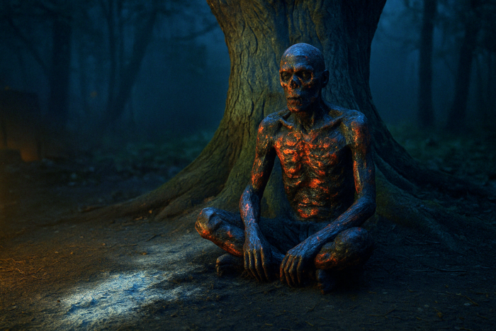 あぐらをかいた姿の男。全身は赤黒く焼け爛れ、皮膚の下には炭のような塊が透けている。顔は半分崩れ、ところどころ骨が露出していた。