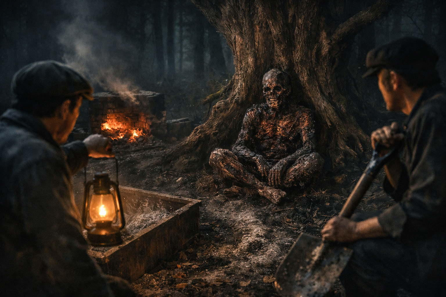 手にしていたシャベルで、炭のような体を滅多打ちにした。湿った森に、骨の折れる音が響いた。蹴り、殴り、引きずるようにして、遺体は再び焼き場へ戻された。