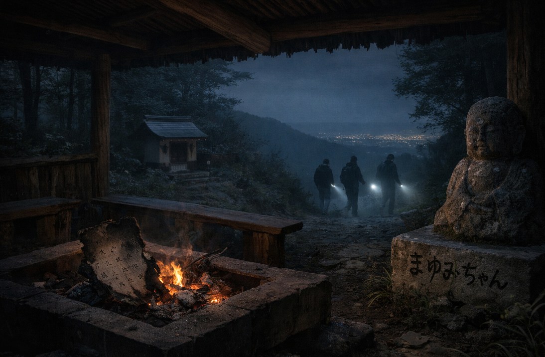 登り始めたのは夜十時過ぎだった。懐中電灯の光だけを頼りに山道を進み、三十分ほどで小屋に着いた。中は囲炉裏と古い椅子があるだけの簡素な造りだった。