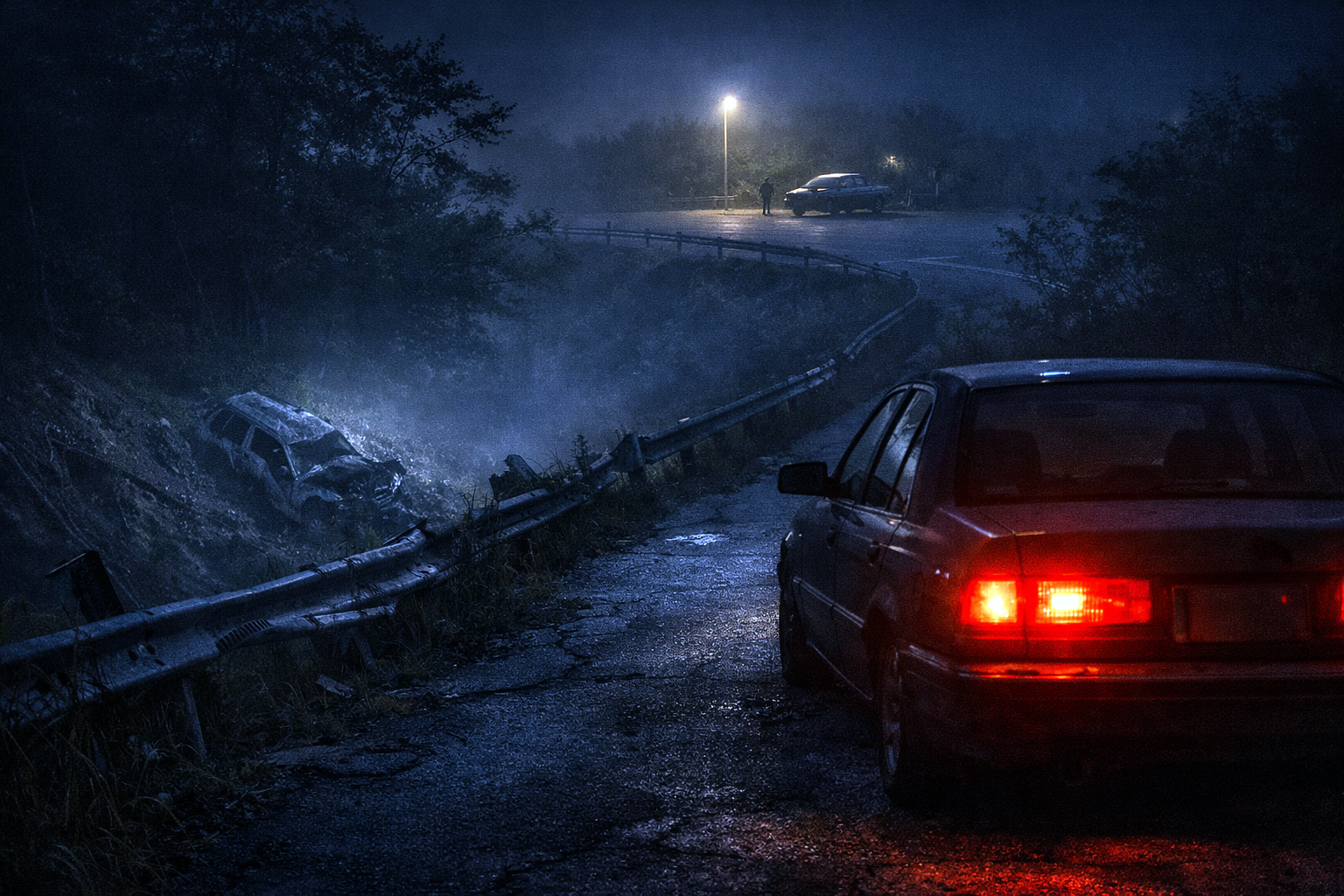 音はどんどん近づいてきて、俺の背後を抜け、少し先でピタリと止まった。テールランプが、赤く道を照らしている。なぜか、車から人が降りてくる気配がまったくない。ただ、エンジン音だけが生きている。
