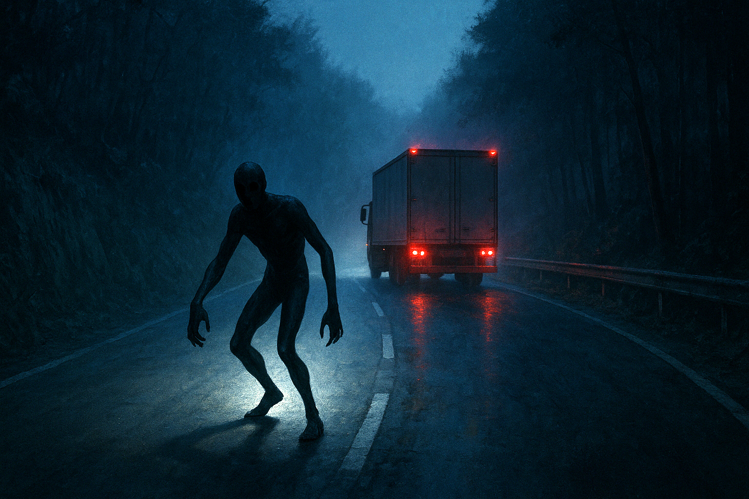 頭の中で何かが切れた。反射的にトラックへ駆け込み、ドアを乱暴に閉めた。エンジンが咆哮し、ライトが闇を切り裂く。隣の男も同じように車に飛び乗り、同時に走り出した。二台のトラックは夜の道路を必死で逃げた。バックミラーを何度も覗いたが、そこに異形の姿はなかった。だが視界の隅で、どこまでも追ってくる気配が消えなかった。